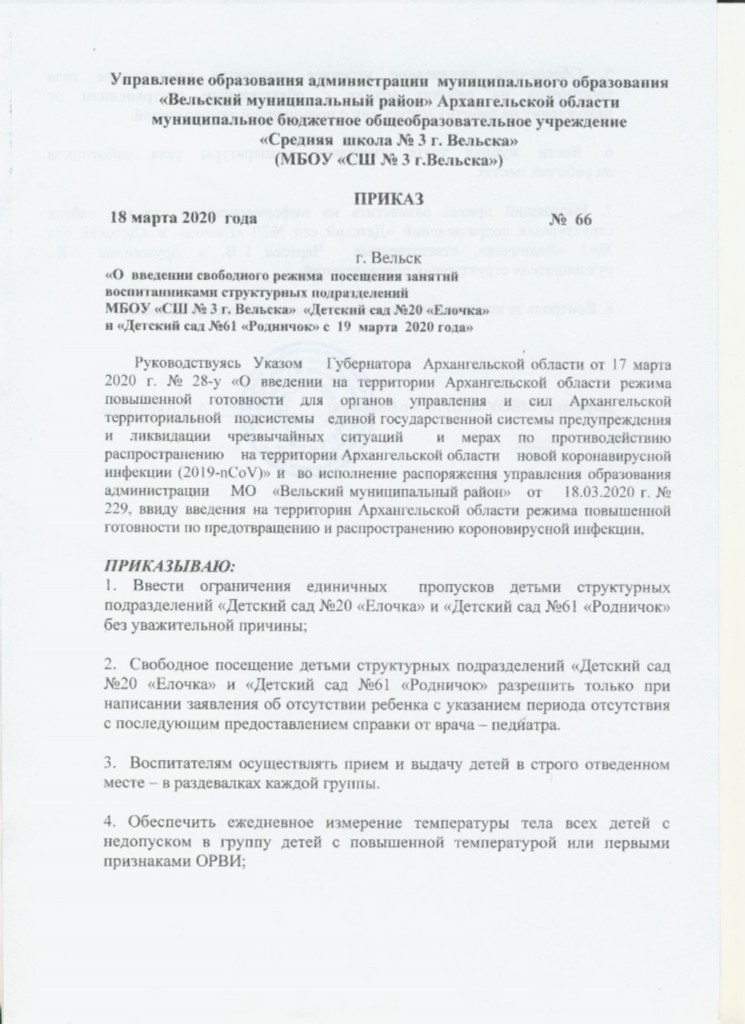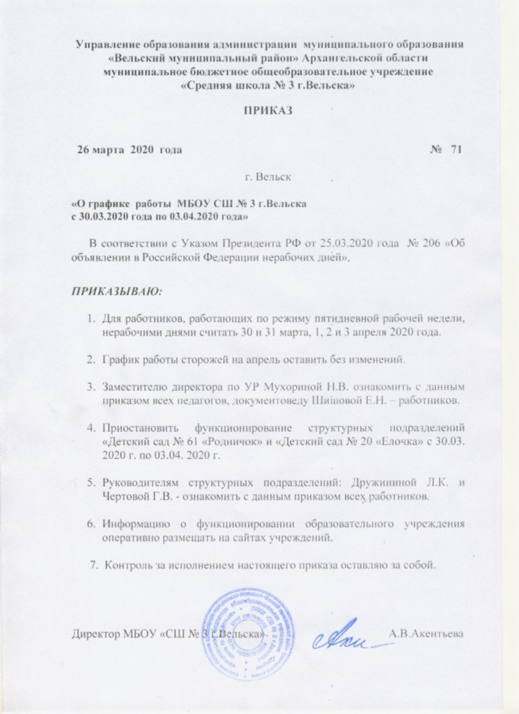 В связи с введением на территории Архангельской области режима повышенной готовности и мер по противодействию распространения новой коронавирусной инфекции, на основании приказа директора МБОУ «СШ № 3 г.Вельска» от 26.03.2020 № 71 считать нерабочими днями 30, 31 марта, 1,2,3 апреля. Учебные занятия в эти дни отменены.